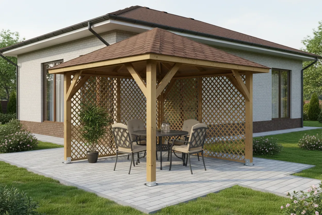 Tato stříška není povinná, ale dodává altánu elegantní a funkční vzhled. Vhodná zejména pro altány s grilem nebo otevřeným ohništěm.