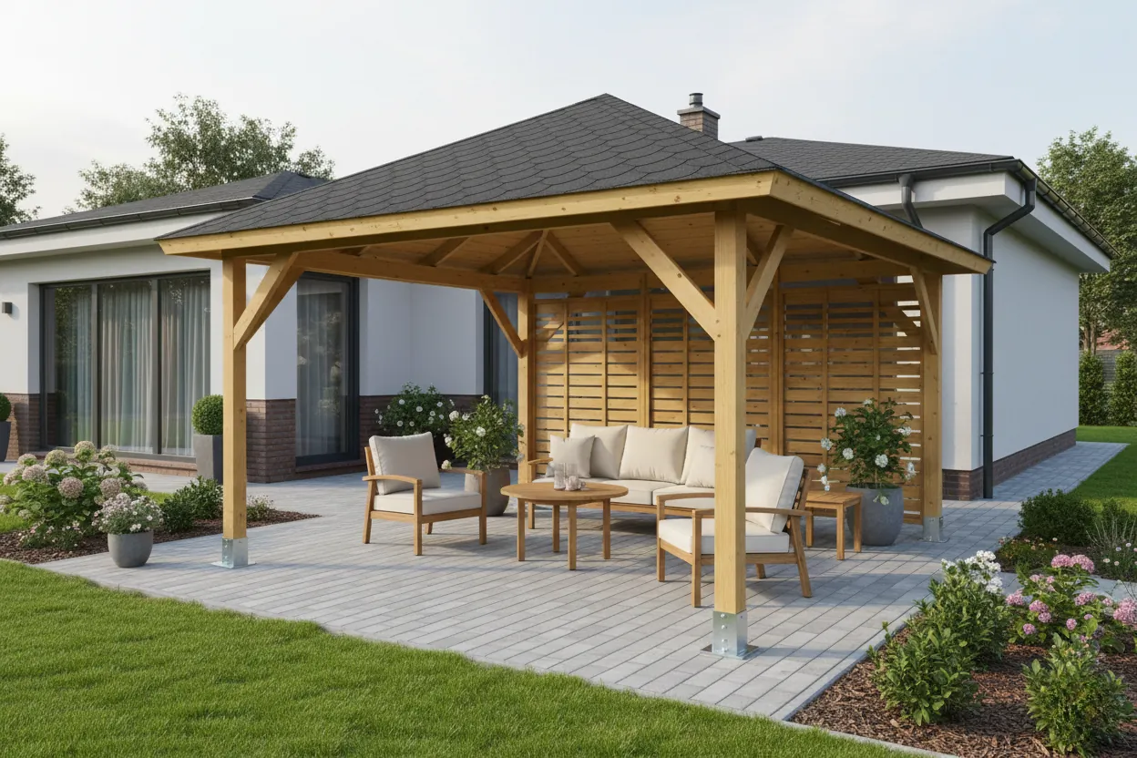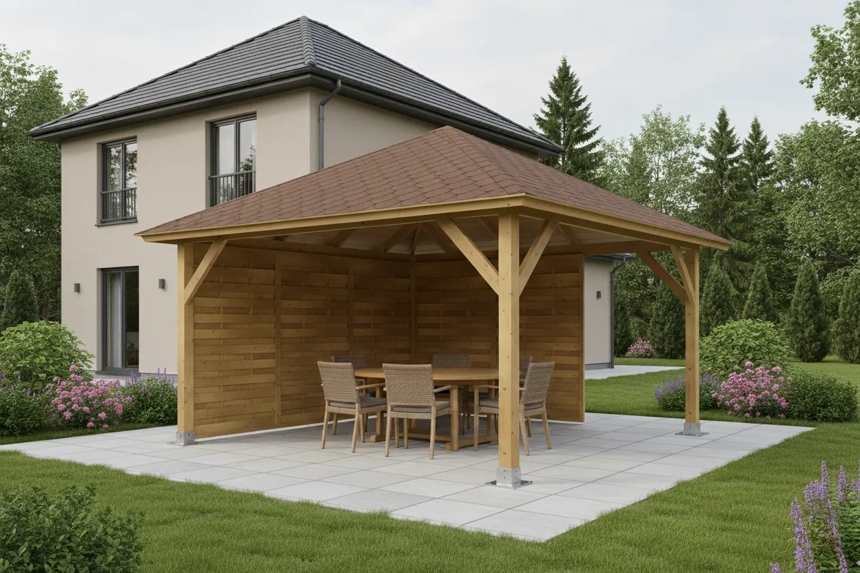 Tato stříška není povinná, ale dodává altánu elegantní a funkční vzhled. Vhodná zejména pro altány s grilem nebo otevřeným ohništěm.