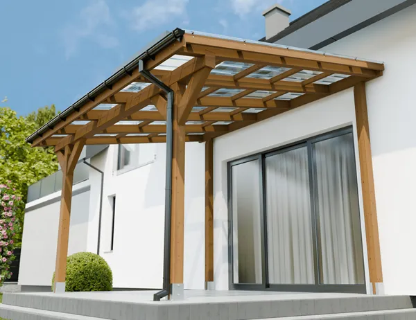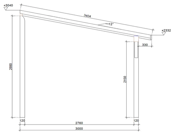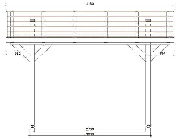 Solidní konstrukce na stojkách 12×12 cm nebo 14×14 cm. Přesah pozednic je přibližně 50 cm na každou stranu, krokví zhruba 30–35 cm. Toto dřevěné zastřešení terasy výrazně rozšíří možnosti využití Vaší terasy a zahrady – získáte chráněný prostor pro posezení i za horšího počasí. Základní verze neobsahuje stojky u zdi – ty lze objednat samostatně za příplatek.