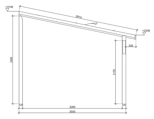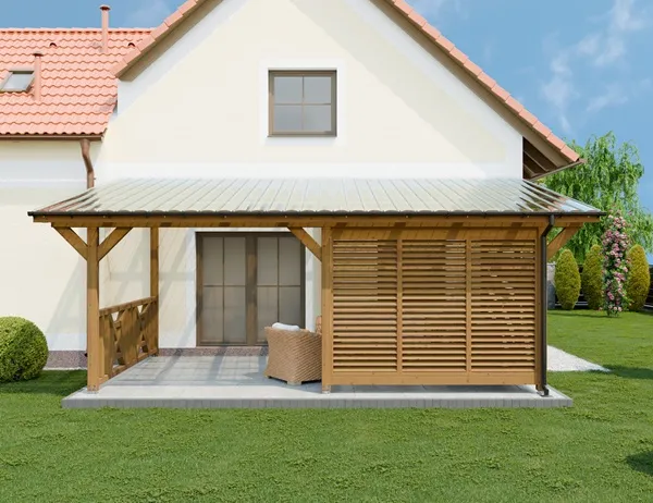 Solidní konstrukce na stojkách 12×12 cm nebo 14×14 cm. Přesah pozednic je přibližně 50 cm na každou stranu, krokví zhruba 30–35 cm. Toto dřevěné zastřešení terasy výrazně rozšíří možnosti využití Vaší terasy a zahrady – získáte chráněný prostor pro posezení i za horšího počasí. Základní verze neobsahuje stojky u zdi – ty lze objednat samostatně za příplatek.
